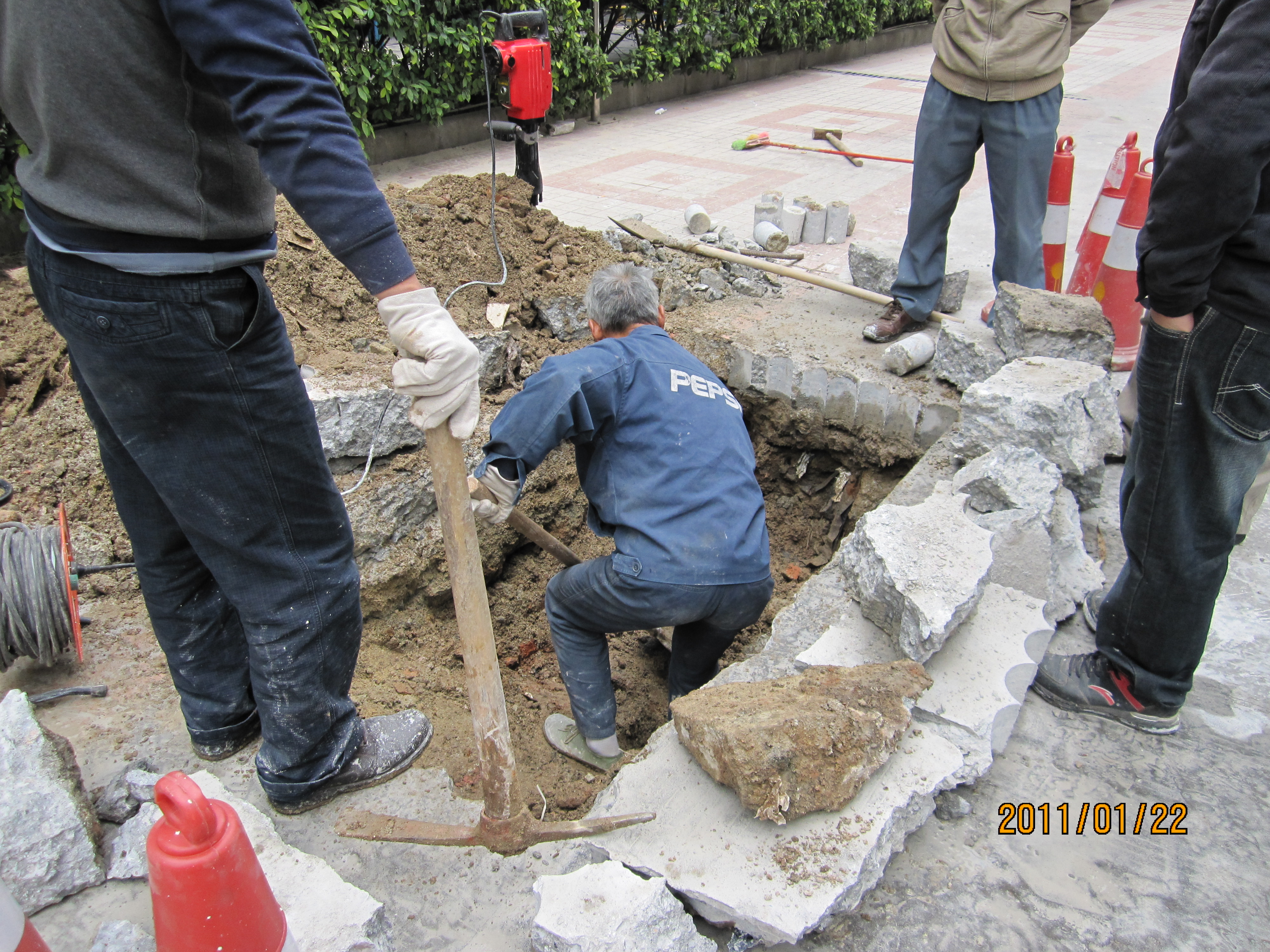 經(jīng)過差不多一整天的開挖,才把那混凝土路面破開,直到挖將近2米的深度才看到一DN200的鑄鐵管承插頭松脫,大股清水噴射出來。吳主任一展愁眉,立即電話給自來水司,叫其趕緊帶上工具來修水管。