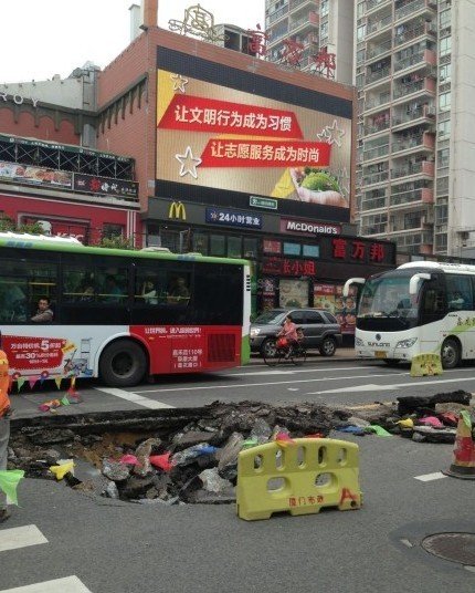 據(jù)目擊者說,幾天前就發(fā)現(xiàn)這里有個小坑,直到前晚9點左右,一輛公交車經(jīng)過后,路面突然開始大范圍坍塌,幾輛先后經(jīng)過的小車,由于沒看清楚,還被蹭到底盤,所幸未被卡住。